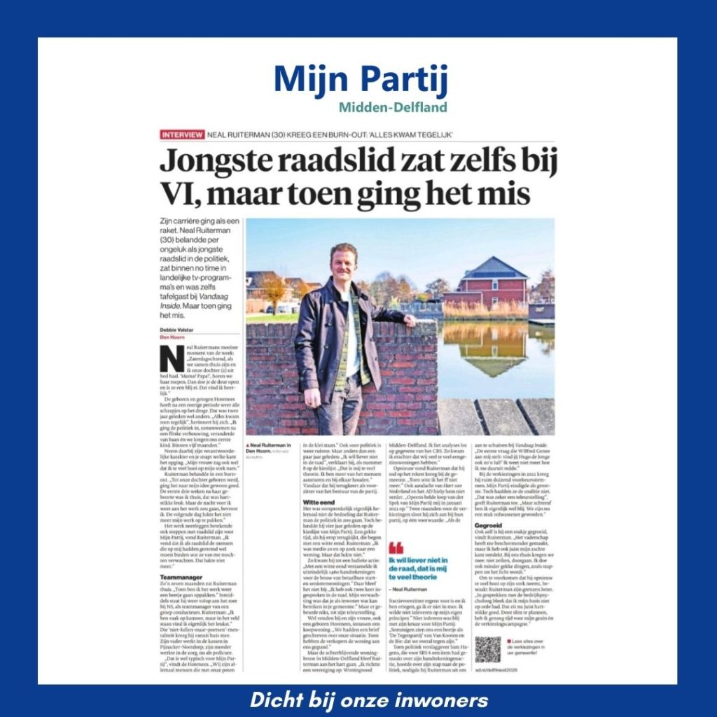 Bij de verkiezingen in 2022 kreeg hij ruim duizend voorkeursstemmen. Mijn Partij eindigde als grootste. Toch haalden ze de coalitie niet. “Dat was zeker een teleurstelling”, geeft Ruiterman toe. “Maar achteraf ben ik eigenlijk wel blij. We zijn nu een stuk volwassener geworden.”