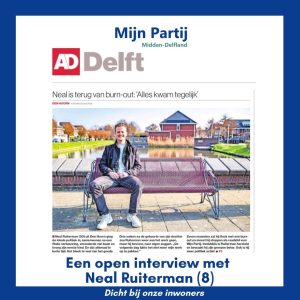 Ook zet ik mij graag in voor de bouw van betaalbare woningen voor starters in onze gemeente, met voorrang voor Midden-Delflanders. In mijn omgeving bij vrienden en ook bij mijzelf merk ik dat het voor starters steeds moeilijker wordt om in onze mooie gemeente te blijven. Dit moet positief veranderen.